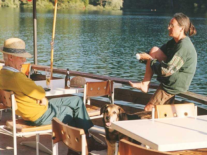 Rosie and father enjoying the late evening sun after a swim in the Cauma See, Flims. |